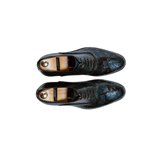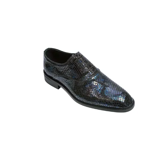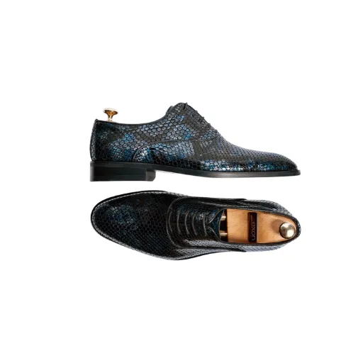 کفش چرم کلاسیک ادیم اکسون مدل آزوریت با رویه چرم پوست ماری طبیعی، آستر و کفی چرم بز مرغوب و زیره میکرولایت. سایزبندی ۳۹ تا ۴۵. تولید شده با تکنولوژی فراوری گیاهی چرم ایتالیا برای تنفسپذیری و راحتی بینظیر
