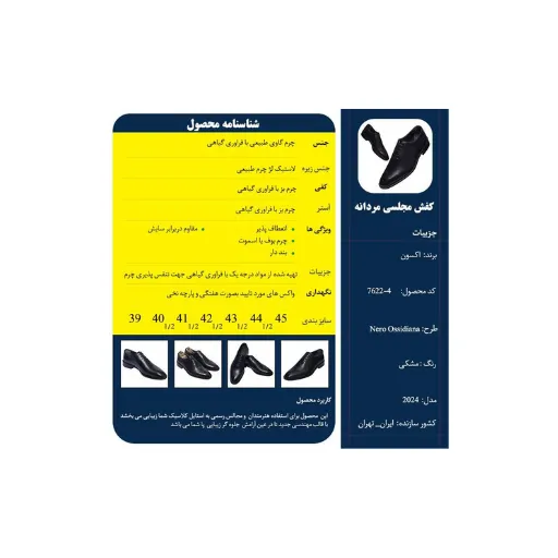 کفش چرم مردانه ادیم اکسون مدل نرو اوسیدیانا با رویه چرم بوف مرغوب، آستر و کفی چرم بز، و زیره میکرولایت. تولید شده با فناوری فرآوری گیاهی چرم ایتالیا. سایزبندی ۴۰ تا ۴۵. مناسب برای محیطهای اداری، مراسم و استفاده روزمره.